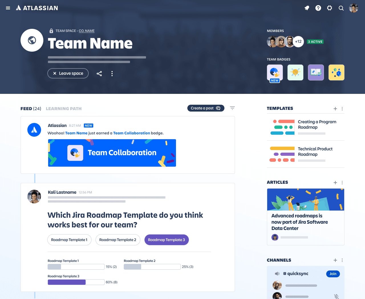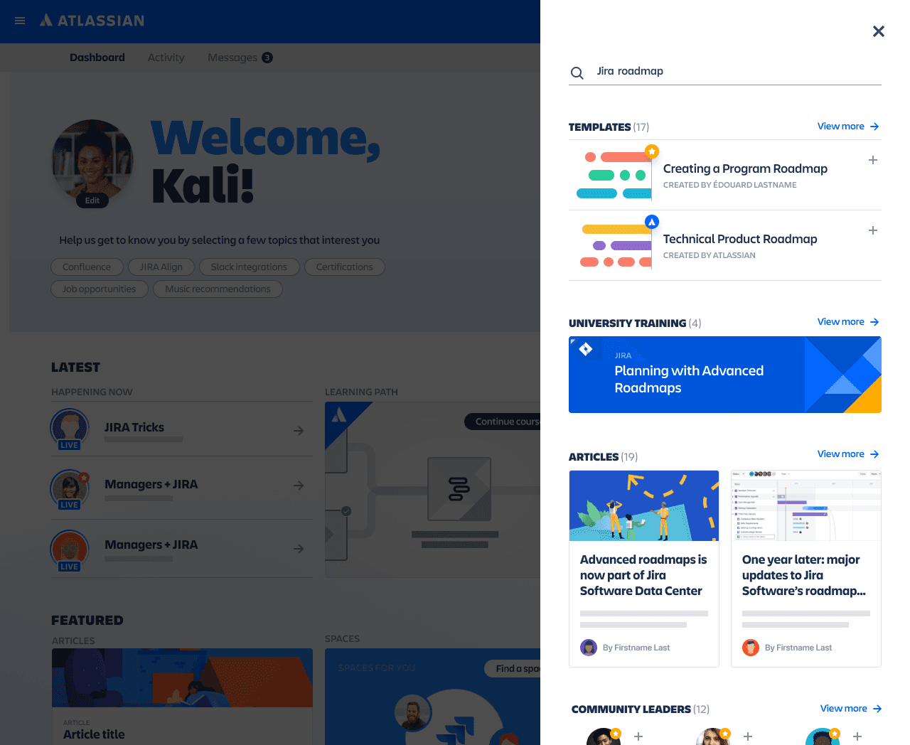 Kali has signed up for an account, and sees her "CommUniversity" dashboard. She searches for a Jira roadmap template she can use for her team.