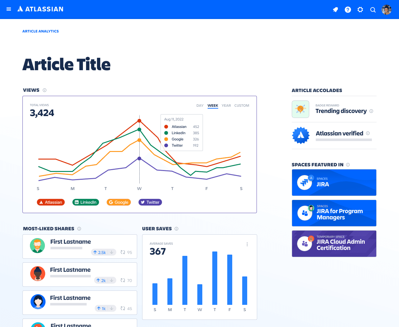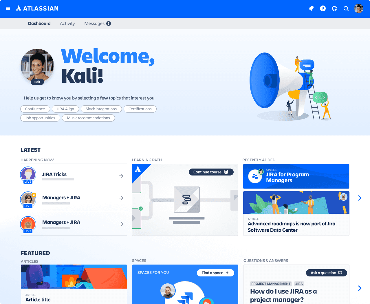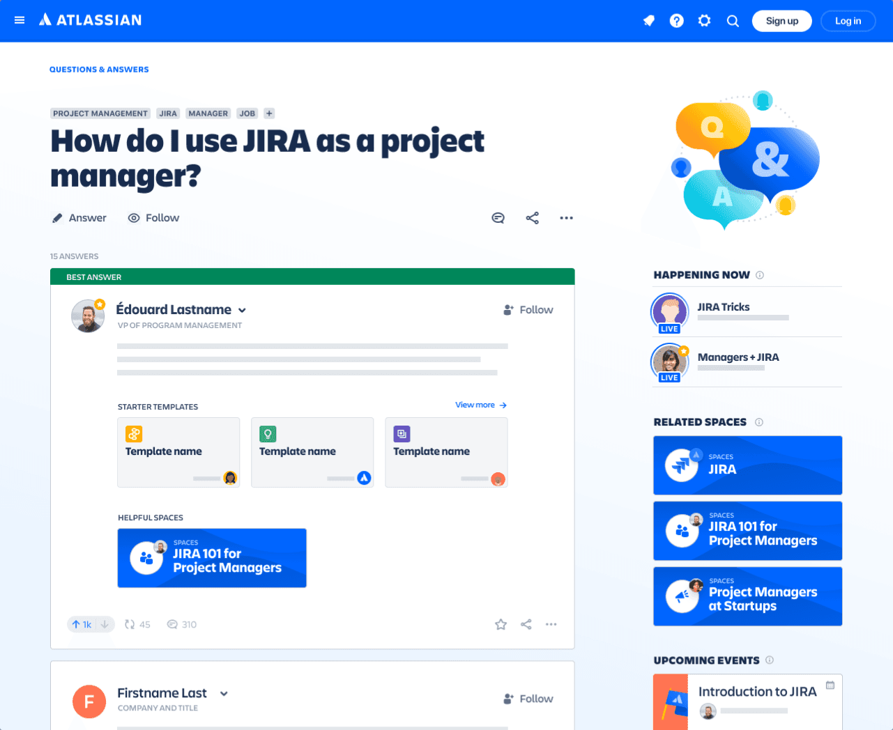 Kali does some research on Jira and finds a question answered by an Atlassian Community Leader. She sees related content including spaces and upcoming events and wants to learn more.
